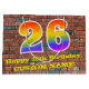 This fun and colourful birthday gift bag design, inspired by graffiti, features a large number "26" having a rainbow spectrum gradient inspired pattern. It also features the message "Happy 26th Birthday,", and a customisable name. The background features a brick wall style pattern. A vibrant birthday themed giftbag like this might be a fun way to wrap a gift or present being given to somebody who is celebrating their twenty sixth birthday. [~Z0000522]