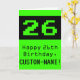 This fun and geeky birthday themed greeting card design features a large green retro computer gaming style number "26" on the front. It also features the birthday greeting message "Happy 26th Birthday,", and a name that can be personalised. The inside features a customisable birthday greeting message, or could perhaps be cleared and left blank if a message is to be written by hand instead. A silly birthday greeting card like this might be used to send a birthday greeting message in honour of the twenty sixth birthday of an engineer, a computer system administrator, or somebody who really likes 8-bit video games. [~Z0000430]