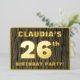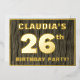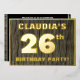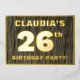 The front of this bold twenty-sixth birthday party foil invitation card features a customisable name, a large number “26th”, the message “BIRTHDAY PARTY!”, and a border, all in foil. There is a rustic, yet elegant, faux wood grain look inspired pattern for the background of the front. The back features personalised details about the event, such as the date, time, venue/place, and any other important information. Editable invitations like these might be used to invite guests to a birthday gathering being held to honour somebody’s 26th birthday. [~Z0000598]