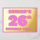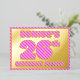 The front of this fun and bold twenty-sixth birthday party foil invitation card features an editable name, a large number “26th”, the message “BIRTHDAY PARTY!”, and a border, all featuring a feminine light pink and dark pink striped pattern. The back features personalised details about the event, such as the date, time, place/venue, and any other relevant information. Editable invitations like these might be used to invite attendees/guests to a birthday gathering being held in celebration of somebody’s 26th birthday. [~Z0000597]