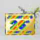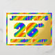The front of this upbeat twenty-sixth birthday celebration/party foil invitation card features a customisable name, a large number “26th”, the message “BIRTHDAY PARTY!”, and a border, all featuring an eye-catching, multicolored, rainbow spectrum inspired gradient pattern. The back features personalised details about the event, such as the date, time, location/venue, and any other information that may be important. Vibrant, exciting, editable invitations like these might be used to invite guests to a birthday party being held to honour somebody’s 26th birthday. [~Z0000593]