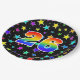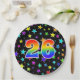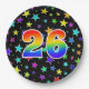 This cheerful, fun, and colourful paper plate design features a large number "26" containing a rainbow spectrum gradient inspired pattern. The background features a pattern of colourful star shapes. Paper plates like this might be fun to use at a celebration being held to honour somebody who is celebrating their twenty sixth birthday, or a couple’s 26th anniversary, or some other 26th event. [~Z0000493]