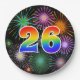 This cheerful, colourful, and fun paper plate design features a large number "26" having a rainbow spectrum gradient inspired pattern colouring. It also features a vibrant and exciting bursting celebratory fireworks inspired pattern. The background is coloured black. Fun paper plates like this might be used at a party being held to celebrate somebody’s 26th birthday, a 26th anniversary, or some other twenty sixth event. [~Z0000490]