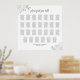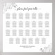 This beautiful wedding seating chart has seating assignments for 27 tables at 10 seats per table or 270 guests. It features a simple yet elegant design with dark grey text on a white background and lacy decorative faux foil silver filigree in the corners. The title is written in fancy script calligraphy and reads: Please find your table. Stylish and sophisticated!