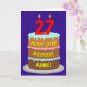 This fun and joyful birthday-themed greeting card design features a depiction of a three-tier birthday cake having numeral-shaped candles on top showing the number “27“, along with the message “HAPPY 27TH BIRTHDAY,”, and a custom recipient name. The inside features a custom birthday greeting message, or could perhaps be cleared and left blank if a message is to be written by hand instead. An upbeat, editable birthday greeting card like this might be used to acknowledge somebody’s twenty-seventh birthday. [~Z0000620]