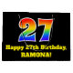 This vibrant and colourful birthday-themed gift bag design features a large number "27" having a rainbow spectrum gradient inspired pattern. It also features the message "Happy 27th Birthday,", and a custom name. The background is coloured black. A fun gift bag like this might be used when wrapping presents being given to somebody in celebration of their twenty seventh birthday. [~Z0000521]