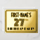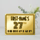 The front of this luxurious and Roaring Twenties inspired twenty-seventh birthday celebration foil invitation card design features a personalised name, an intricate art deco style inspired number “27th”, the message “BIRTHDAY PARTY”, and a border pattern consisting of lines. The back features personalised details about the event, such as the date, time, venue/place, and any other information that may be important. Elegant, stylish, customisable invitations like these might be used to invite guests/attendees to a birthday gathering being held to celebrate somebody’s 27th birthday. [~Z0000594]