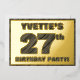 The front of this bold twenty-seventh birthday celebration/party foil invitation card features a customisable name, a large number “27th”, the message “BIRTHDAY PARTY!”, and a border, all featuring a rustic, yet elegant, faux wood grain look inspired pattern. The back features personalised details about the event, such as the date, time, place/venue, and any other relevant information. Editable invitations like these might be used to invite guests to a birthday gathering/party being held in celebration of somebody’s 27th birthday. [~Z0000595]