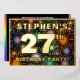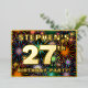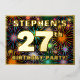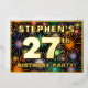 The front of this upbeat twenty-seventh birthday party/celebration foil invitation card design features an editable name, a large number “27th”, the message “BIRTHDAY PARTY!”, and a border. The background of the front has an exciting, colourful bursting celebratory fireworks-inspired pattern. The back features personalised details about the event, such as the date, time, location, and any other useful information. Customisable invitations like these might be a fun way to invite attendees to a birthday party being held in celebration of somebody’s 27th birthday. [~Z0000602]