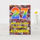 The front of this colorful, rustic, and autumn-themed birthday greeting card design features a large number "27" with a rainbow spectrum gradient inspired pattern, along with the message "Happy 27th Birthday,", and a custom name. The front features a background depicting rustic fallen autumn leaves. The inside features a custom birthday greeting message, or could perhaps be cleared and left blank if a message is to be written by hand instead. A personalized birthday card like this might be a fun way to send a message in celebration of somebody’s twenty seventh birthday. [~Z0000384]