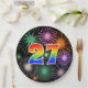 This cheerful, colourful, and fun paper plate design features a large number "27" containing a rainbow spectrum gradient inspired pattern colouring. It also features a exciting and vibrant bursting celebratory fireworks inspired pattern. It has a black coloured background. Paper plates like this might be used at a party celebrating somebody’s 27th birthday, a twenty seventh anniversary, or some other 27th event. [~Z0000490]