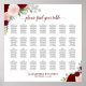 This rustic 28 table wedding seating chart features a beautiful boho chic floral design with hand painted watercolor roses in shades of burgundy, red, and blush pink. There are sprigs of eucalyptus leaves and garden greenery and an elegant script calligraphy title, with the names of the couple and wedding date at the bottom. The traditional layout has seating assignments for 280 guests with 10 seats per table. Great way to add elegance and style to your wedding reception while making it easy for your guests to find their tables.