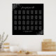This beautiful wedding seating chart features a simple yet elegant design with pale grey text on a black background. The title is written in script calligraphy lettering and reads: please find your table. The chart is decorated with a frilly floral faux foil silver filigree in the corners. Contains seating assignments for 28 tables at 10 guests per table or 280 guests.