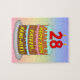 this cheerful and colourful birthday themed jigsaw puzzle design features a cartoon-style depiction of a three-tier birthday cake having numeral-shaped candles on top showing the number “28“, along with the message “HAPPY 28TH BIRTHDAY,”, and an editable recipient name. The background has a multicolored pastel rainbow spectrum inspired gradient pattern. A joyful, editable birthday puzzle like this might be used to acknowledge somebody’s twenty-eighth birthday. [~Z0000621]