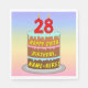 This fun and joyful birthday-themed paper napkin design features a cartoon-style depiction of a three-tier birthday cake having numeral-shaped candles on top showing the number “28“, along with the message “HAPPY 28TH BIRTHDAY,”, and a custom recipient name. The background has a multi-colour pastel rainbow spectrum inspired gradient pattern. Cheerful paper napkins like these might be used when hosting a birthday party for somebody in celebration of their twenty eighth birthday. [~Z0000623]