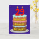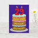 The front of this cheerful and fun birthday themed greeting card design features a depiction of a three-tier birthday cake having numeral-shaped candles on top showing the number “29“, along with the message “HAPPY 29TH BIRTHDAY,”, and an editable recipient name. The inside has an editable birthday greeting message, or could perhaps be cleared and left blank if a message is to be written by hand instead. A joyful, customisable birthday greeting card like this might be a fun way to send a birthday greeting message to somebody who is celebrating their twenty-ninth birthday. [~Z0000620]