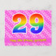 The front of this fun, upbeat, and cheerful birthday themed postcard design features a large number "29" with a rainbow spectrum gradient inspired pattern, along with the message "Happy 29th Birthday,", and a personalised recipient name. The front additionally features a happy dark pink and light pink heart shapes and stripes pattern. The back features a custom birthday greeting message, or could perhaps be cleared and left blank if a message is to be written by hand instead. A personalised birthday postcard like this might be a fun way to send a message in celebration of somebody’s twenty ninth birthday. Postcards like this might also be used to invite guests to a birthday party or celebration being held for somebody who is turning 29 years old. [~Z0000449]