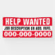 Are you hiring and want to get the word out? This 2.5' x 6' single sided, "Help Wanted" banner with job description line and phone number, is fully customisable! For indoor or outdoor use. All banners are hemmed and welded for a clean finished edge. For easy outdoor installation, on any surface, use the grommet option.