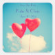 Save the date sticker for you to personalise with your own wedding details. 2 bright red heart shaped balloons floating upwards into the blue sky with some white fluffy clouds behind them.