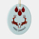 Christmas ornament which says "Merry Christmas" in curved text. Designed with an illustration of 2 Christmas deer jumping. Deer are made of red and black lumberjack plaid, with a little heart in between them. Red and black plaid Christmas decorations hang down from the top.