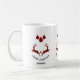 A personalised mug which say "Merry Christmas" in curved text. Designed with an illustration of 2 Christmas deer jumping. Deer are made of red and black lumberjack plaid, with a little heart in between them. Red and black plaid Christmas decorations hang down from the top.