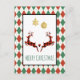 A holiday postcard which says "Merry Christmas" on the front and has a personalised message on the back. Designed with an illustration of 2 Christmas deer jumping. Deer are made of red and black lumberjack plaid, with a little heart in between them. Faux gold glitter christmas decorations hang down from the top. The background is a red and green argyle pattern.
