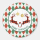 A holiday magnet which says "Merry Christmas" in curved text. Designed with an illustration of 2 Christmas deer jumping. Deer are made of red and black lumberjack plaid, with a little heart in between them. Faux gold glitter Christmas decorations hang down from the top. The background is a red and green argyle pattern.