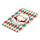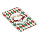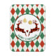 Flex-magnet which says "Merry Christmas" in curved text. Designed with an illustration of 2 Christmas deer jumping. Deer are made of red and black lumberjack plaid, with a little heart in between them. Faux gold glitter Christmas decorations hang down from the top. The background is a red and green argyle pattern.