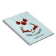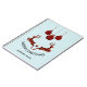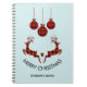A personalised notebook which says "Merry Christmas" in curved text. Designed with an illustration of 2 Christmas deer jumping. Deer are made of red and black lumberjack plaid, with a little heart in between them. Red and black plaid Christmas decorations hang down from the top. Light blue background.