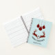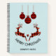 A personalised spiral notebook which says "Merry Christmas" in curved text. Designed with an illustration of 2 Christmas deer jumping. Deer are made of red and black lumberjack plaid, with a little heart in between them. Red and black plaid Christmas decorations hang down from the top.