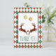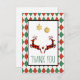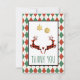 A Christmas Thank You card personalised on the back. Designed with an illustration of 2 Christmas deer jumping. Deer are made of red and black lumberjack plaid, with a little heart in between them. Gold (faux) glitter christmas decoration hang down from the top. The background is a red and green argyle pattern.