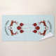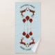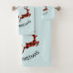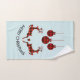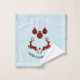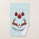 A towel set which say "Merry Christmas" in curved text. Designed with an illustration of 2 Christmas deer jumping. Deer are made of red and black lumberjack plaid, with a little heart in between them. Red and black plaid Christmas decorations hang down from the top. Light blue background.