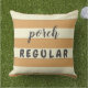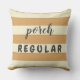 Text says "porch REGULAR" on one side, and "garden GUEST" on the other. Text can easily be customised in order to create fun and relevant alternatives, maybe even contrasting on each side of the pillow. With several pillows it might even turn into some fun game.
