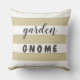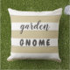 Text says "garden GNOME" on one side, and "porch VISITOR" on the other. Text can easily be customised in order to create fun and relevant alternatives, maybe even contrasting on each side of the pillow. With several pillows it might even turn into some fun game.