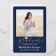 Invite family and friends to celebrate a high school or college graduation with stylish custom 2 photo navy blue, white and gold foil invitations. Pictures and wording are simple to personalise. (IMAGE PLACEMENT TIP: An easy way to centre a photo exactly how you want is to crop it before uploading to the Zazzle website.) Front of design is printed with real metallic foil on a blue background. It features a mortar board cap, handwritten style script calligraphy, elegant modern typography, and two photos of your choice, such as senior pictures or images from the commencement ceremony. This elegant graduation invitation card is a trendy and chic way to begin your special day celebration. Congratulations to the graduate!