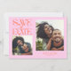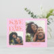 Elegant and modern save the date card featuring a mystical typography text that says "save the date." There are 2 photos on the front and one on the back. The background is orange and pink.