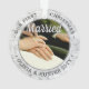 Celebrate a joyful 1st holiday as Mr. & Mrs. with a custom 2 photo "Our First Christmas Married" round ceramic ornament. All text and images on this template are simple to personalise and can be different or the same on front and back. As an idea, the script typography can read "Together" or "Engaged." (IMAGE & TEXT DESIGN TIPS: 1) To adjust position of wording, add spaces at beginning or end. 2) To centre the photo exactly how you want, crop it into a square shape before uploading to the Zazzle website.) Design features a stylish modern black and white faux marble border, handwritten style script calligraphy names & year, and two pictures of your choice. This unique & modern keepsake adds an elegant touch to Xmas home decorations. Makes a cute wedding gift idea for the bride and groom. Example photo on front is by Tim Stagge (Source: @tim_stagge on Unsplash).