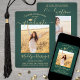 Share the joy of a high school or college graduation with these custom 2 photo green and gold announcements. (IMAGE PLACEMENT TIP: An easy way to centre a picture exactly how you want is to crop it before uploading to the Zazzle website.) This template is simple to customise with any wording of your choice, such as party invitation details, parents' names, special honours, degree title, favourite inspirational quote, graduate's contact info, future education plans, or new job position. If there's any text not wanted simply delete it. Design features a green ombre background, faux foil mortar board cap, handwritten style script calligraphy, modern minimalist typography, and two photos of your choice, such as senior pictures or images from the commencement ceremony. Please note that gold is printed colour, not metallic foil. These elegant graduation announcement cards are a trendy and chic way to share your special day celebration with family and friends. Congratulations to the graduate!