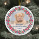 Add an elegant touch to holiday decorations with a custom photo round ceramic Christmas ornament. Wording and pictures on this template are simple to personalise, and can be different or the same on front and back. The modern red, white, blue and green design features stylish vintage typography and a festive colourful retro floral wreath framing one picture of your choice. The text is easy to customise for a pet memorial or first Christmas keepsake ornament. This unique ornament adds a stylish touch to Xmas home decorations. Bordeaux puppy photography by Ilona Krijgsman. Happy Holidays!