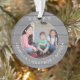 Celebrate the simple joys of the holidays with a stylish custom photo round acrylic Christmas ornament. The pictures and all wording on this template are simple to personalise and can be different or the same on front and back. (IMAGE PLACEMENT TIP: An easy way to position a photo exactly how you want is to crop it before uploading to the Zazzle website.) The modern farmhouse style design features a rustic grey faux wood border, classic typewriter typography names and year, and 2 pictures of your choice. This unique family keepsake adds an elegant touch to Xmas home decorations.