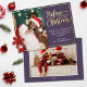 Modern holiday greeting card featuring one of your favourite Christmas family portraits on the left complemented by a real gold foil frame and wording that reads "Believe in the magic of Christmas" on the right over an elegant violet background, customisable with your own greeting message.