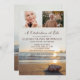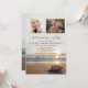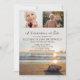 Elegant memorial service invitation, featuring a conch lying on a beach at sunrise and two photos of your loved one at the top for an ocean themed memorial service or a funeral service taking place ocean side or on the beach.
