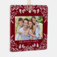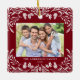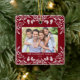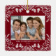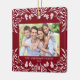 This dark red Christmas ornament showcases an elegant white winter greenery illustration that frames the horizontal photo. The design offers space for 2 photos, one on the front and another on the back. Personalise this lovely keepsake ornament with your family name and the year.