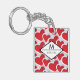 A personalised keychain with a repeating pattern of 2 different sized red hearts each heart surrounded by a white border. A diamond shaped frame layered over top with