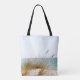 Inspirational quote custom tote bag depicts a beautiful ocean beach with sea grass on the dune and features Bible Verse 2 Timothy 1:7, "For GOD has not given us a spirit of fear, but of POWER and of LOVE and of a SOUND MIND."
