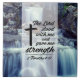 Christian inspirational quote scripture ceramic tile depicts a nature photograph of a beautiful waterfall. It features a cross and a portion of an encouraging Bible Verse 2 Timothy 4:17, "The Lord stood with me and gave me strength."