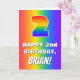 The front of this cheerful and joyful birthday greeting card design features a large number “2” having a rainbow spectrum inspired gradient pattern. It also features the message “HAPPY 2nd BIRTHDAY,”, and an editable name. The background on the front also has an exciting multicolored rainbow spectrum gradient pattern. The inside has an editable birthday greeting message, or could perhaps be cleared and left blank if a message is to be written by hand instead. A cheerful, personalised birthday greeting card like this might be a fun way to send some birthday wishes to somebody who is celebrating their second birthday. [~Z0000570]