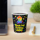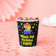 This exciting and cheerful birthday-themed paper cup design features a large number “2” having a rainbow spectrum gradient inspired pattern. It also features the message “Happy 2nd Birthday,”, and a personalised name. The background features an exciting and colourful pattern featuring many star shapes with different colours and sizes. Colourful, vibrant paper cups like this might be fun to use at a birthday party being held to celebrate somebody’s 2nd birthday. [~Z0000540]