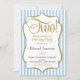 An elegant blue gold boys 2nd birthday invitation, featuring pastel blue and white stripes with a faux gold glitter accent frame, cute black and gold text and a huge fancy "Two!" at the top. For your favourite two year old birthday boy.