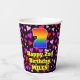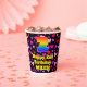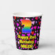 This happy and fun birthday paper cup design features a large number “2” having a rainbow spectrum gradient inspired pattern. It also features the message “Happy 2nd Birthday,”, and a custom name. The background features a pattern of purple, pink, and red heart shapes. Cheerful, upbeat paper cups like this might be fun to use at a birthday celebration/party being held to honour somebody’s second birthday. [~Z0000548]